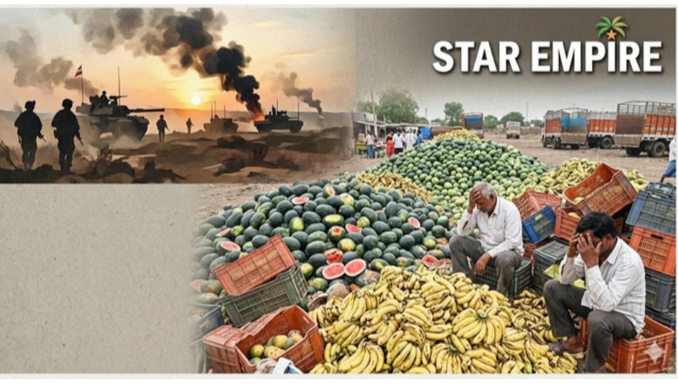आखाती देशांतील युद्धजन्य परिस्थिती आणि बाजारपेठेतील अनिश्चिततेमुळे कलिंगड आणि केळी उत्पादक शेतकऱ्यांवर आभाळ फाटले आहे. अवघ्या १० दिवसांत कलिंगडाचे दर ४० रुपयांवरून थेट १० ते १५ रुपयांवर कोसळल्याने शेतकऱ्यांचे कोट्यवधींचे नुकसान झाले असून, हातातोंडाशी आलेला घास हिरावला गेला आहे.