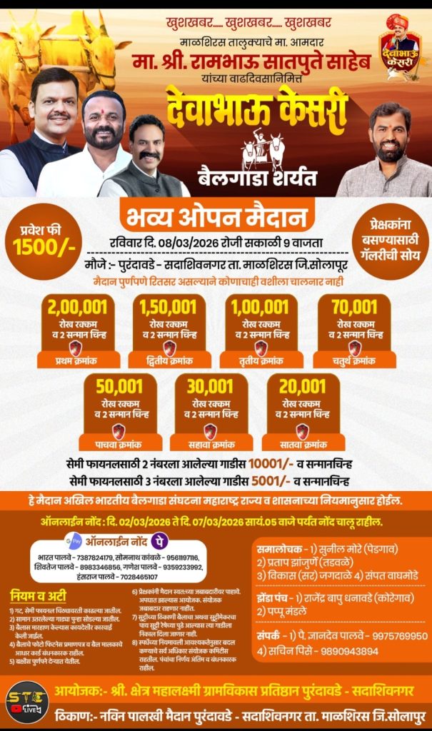 माळशिरस तालुक्याचे लोकप्रिय आमदार मा. श्री. रामभाऊ सातपुते साहेब यांच्या वाढदिवसाचे औचित्य साधून पुरंदावडे-सदाशिवनगर येथे भव्य ‘देवाभाऊ केसरी’ बैलगाडा शर्यतीचे आयोजन करण्यात आले आहे. उद्या, रविवार दि. ०८ मार्च २०२६ रोजी सकाळी ९ वाजल्यापासून या शर्यतीला प्रारंभ होणार असून, सोलापूर जिल्ह्यातील हे एक मोठे ‘ओपन मैदान’ ठरणार आहे.श्री क्षेत्र महालक्ष्मी ग्रामविकास प्रतिष्ठान, पुरंदावडे-सदाशिवनगर यांच्या वतीने या भव्य स्पर्धेचे नियोजन करण्यात आले आहे. पुरंदावडे येथील नवीन पालखी मैदानावर या शर्यती पार पडतील. या स्पर्धेचे वैशिष्ट्य म्हणजे हे मैदान पूर्णपणे रितसर असून, कोणत्याही प्रकारचा वशिला चालणार नाही, अशी ग्वाही आयोजकांनी दिली आहे.लाखोंची बक्षिसे आणि मानाची गदाया स्पर्धेत सात क्रमांकापर्यंत रोख रकमेची मोठी बक्षिसे आणि सन्मानचिन्ह दिले जाणार आहेत: * प्रथम क्रमांक: २,००,००१ रुपये व सन्मानचिन्ह * द्वितीय क्रमांक: १,५०,००१ रुपये व सन्मानचिन्ह * तृतीय क्रमांक: १,००,००१ रुपये व सन्मानचिन्ह * चतुर्थ क्रमांक: ७०,००१ रुपये व सन्मानचिन्ह * पाचवा ते सातवा क्रमांक: अनुक्रमे ५० हजार, ३० हजार आणि २० हजार रुपये.तसेच सेमी फायनलमध्ये दुसऱ्या व तिसऱ्या क्रमांकावर येणाऱ्या गाड्यांनाही विशेष रोख बक्षिसे देऊन गौरविण्यात येणार आहे.शिस्तबद्ध नियोजन आणि नियमअखिल भारतीय बैलगाडा संघटना आणि शासनाच्या नियमांनुसार ही स्पर्धा पार पडणार आहे. बैलांना मारहाण करण्यास सक्त मनाई असून, बैलांचे फोटो फिटनेस प्रमाणपत्र आणि बैल मालकाचे आधार कार्ड अनिवार्य करण्यात आले आहे. प्रेक्षकांसाठी गॅलरीची विशेष सोय करण्यात आली असून, मोठ्या संख्येने बैलगाडा शौकीन या ठिकाणी उपस्थित राहण्याची शक्यता आहे.या स्पर्धेसाठी समालोचक म्हणून सुनील मोरे (पेडगाव), प्रताप झांजुर्णे (तडवळे), विकास जगदाळे आणि संपत वाघमोडे हे काम पाहणार आहेत. तर झेंडा पंच म्हणून राजेंद्र बापू धनावडे आणि पप्पू मंडले यांची नियुक्ती करण्यात आली आहे.या भव्य आयोजनामुळे संपूर्ण माळशिरस तालुक्यात उत्साहाचे वातावरण असून, ‘देवाभाऊ केसरी’चा किताब कोणता बैलगाडा पटकावणार, याकडे सर्वांचे लक्ष लागले आहे.