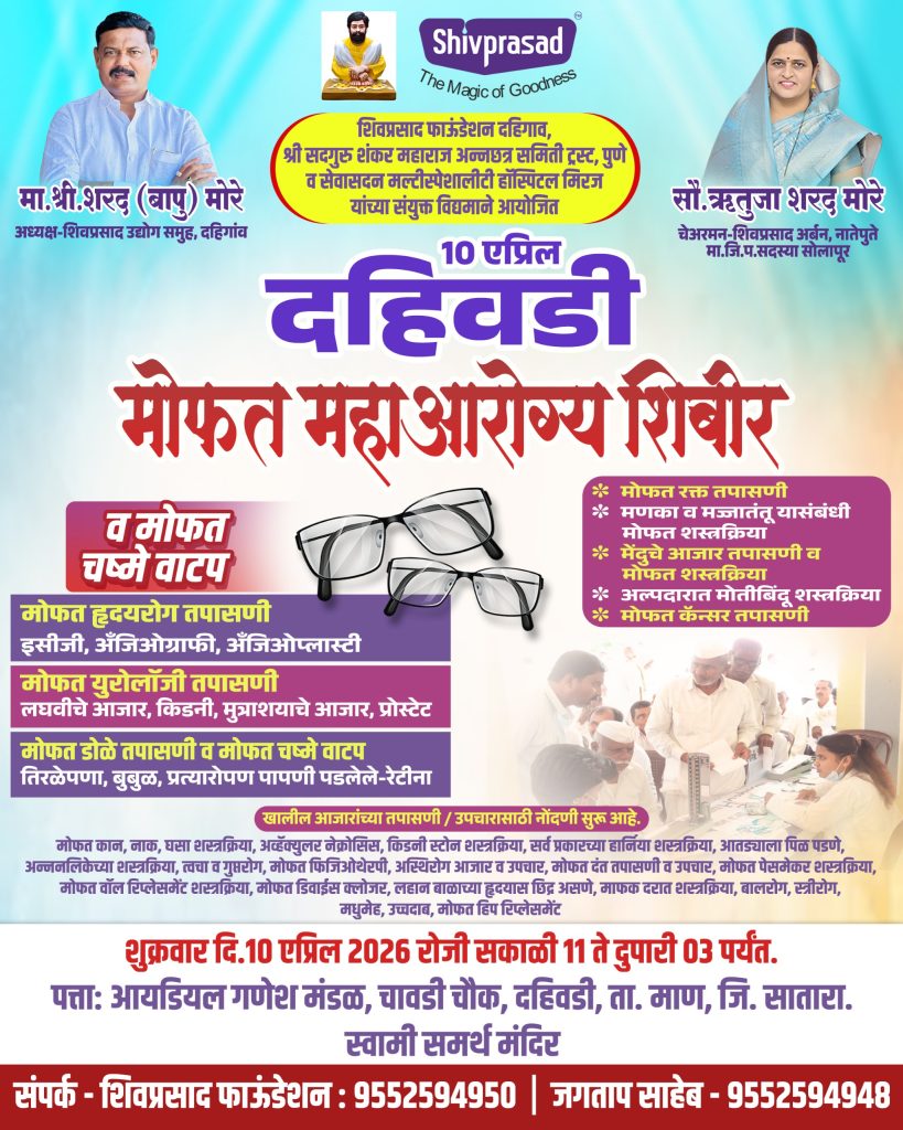 दहिवडी (ता. मान, जि. सातारा) येथे शुक्रवार दिनांक 10 एप्रिल 2026 रोजी मोफत आरोग्य शिबिराचे भव्य आयोजन करण्यात आले आहे. शिवप्रसाद उद्योग समूहाचे अध्यक्ष श्री. शरद बापू मोरे यांच्या मार्गदर्शनाखाली शिवप्रसाद फाउंडेशन दहिगाव, सद्गुरू शंकर महाराज ट्रस्ट पुणे आणि सेवासदन हॉस्पिटल मिरज यांच्या संयुक्त विद्यमाने हे शिबिर पार पडणार आहे.