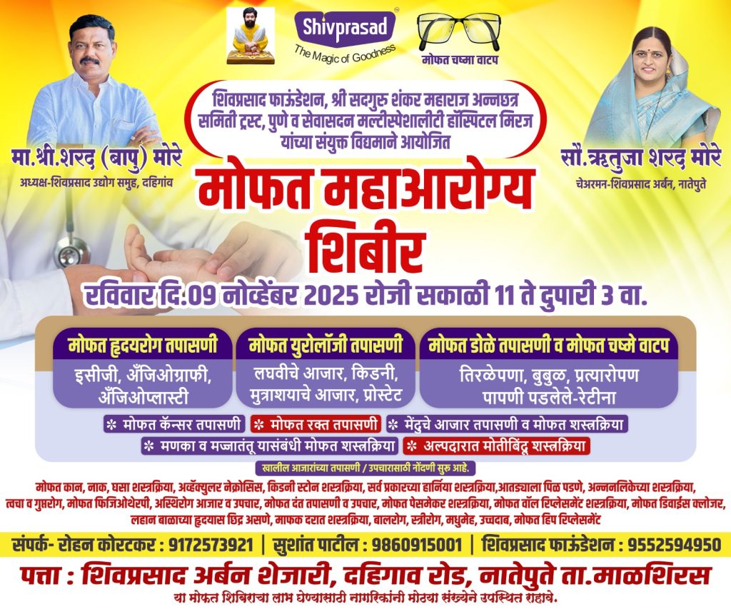 शिवप्रसाद फाऊंडेशन शरद बापू मोरे व ऋतुजा तई मोरे, श्री सदगुरु शंकर महाराज अन्नछत्र समिती ट्रस्ट, पुणे व सेवासदन मल्टीस्पेशालीटी हॉस्पिटल मिरज यांच्या संयुक्त विद्यमाने नातेपुते तालुका माळशिरस येथे भव्य उद्या दिनांक 9 नोव्हेंबर 2025 रोजी सकाळी 11 ते दुपारी वाजेपर्यंत पर्यंत भव्य आरोग्य शिबिराच्या आयोजन करण्यात आले आहे.यामध्ये मोफत हृदयरोग तपासणीइसीजी, अँजिओग्राफी, अँजिओप्लास्टीमोफत युरोलॉजी तपासणीलघवीचे आजार, किडनी, मुत्राशयाचे आजार, प्रोस्टेटमोफत डोळे तपासणी व मोफत चष्मे वाटपतिरळेपणा, बुबुळ, प्रत्यारोपण पापणी पडलेले-रेटीनमोफत कॅन्सर तपासणीमोफत रक्त तपासणीमेंदुचे आजार तपासणी व मोफत शस्त्रक्रिया मणका व मज्जातंतू यासंबंधी मोफत शस्त्रक्रियाअल्पदारात मोतीबिंदू शस्त्रक्रिया खालील आजारांच्या तपासणी / उपचारासाठी नोंदणी सुरु आहे.मोफत कान, नाक, घसा शस्त्रक्रिया, अव्हॅक्युलर नेक्रोसिस, किडनी स्टोन शस्त्रक्रिया, सर्व प्रकारच्या हार्निया शस्त्रक्रिया, आतड्याला पिळ पडणे, अन्ननलिकेच्या शस्त्रक्रिया, त्वचा व गुप्तरोग, मोफत फिजिओथेरपी, अस्थिरोग आजार व उपचार, मोफत दंत तपासणी व उपचार, मोफत पेसमेकर शस्त्रक्रिया, मोफत वॉल रिप्लेसमेंट शस्त्रक्रिया, मोफत डिवाईस क्लोजर, लहान बाळाच्या हृदयास छिद्र असणे, माफक दरात शस्त्रक्रिया, बालरोग, स्त्रीरोग, मधुमेह, उच्चदाब, मोफत हिप रिप्लेसमेंट करण्यात येणार असून या शिबिराचा जास्तीत जास्त रुग्णांनी लाभ घ्यावा असे आवाहन शिवप्रसाद फाउंडेशन चे चेअरमन शरद बापू मोरे व मा. जिल्हा परिषद सदस्य ऋतुजाताई मोरे रमेश आप्पा मोरे यांनी आवाहन केले आहे.