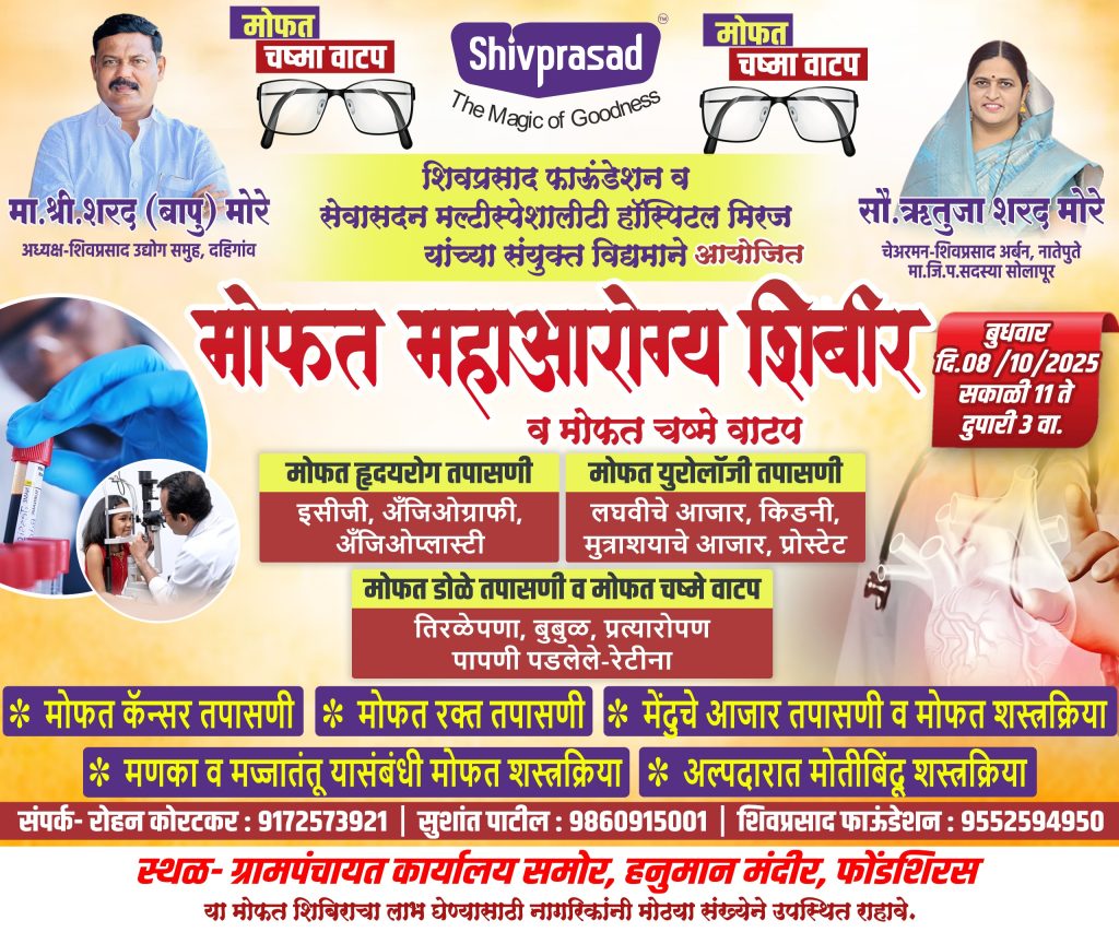 फोंडशिरस येथे शरद बापू मोरे यांच्या शिवप्रसाद फाउंडेशन व सेवासदन मल्टीस्पेशालिटी हॉस्पिटल मिरज यांच्य वतीने मोफत आरोग्य शिबिर व मोफत चष्मे वाटप