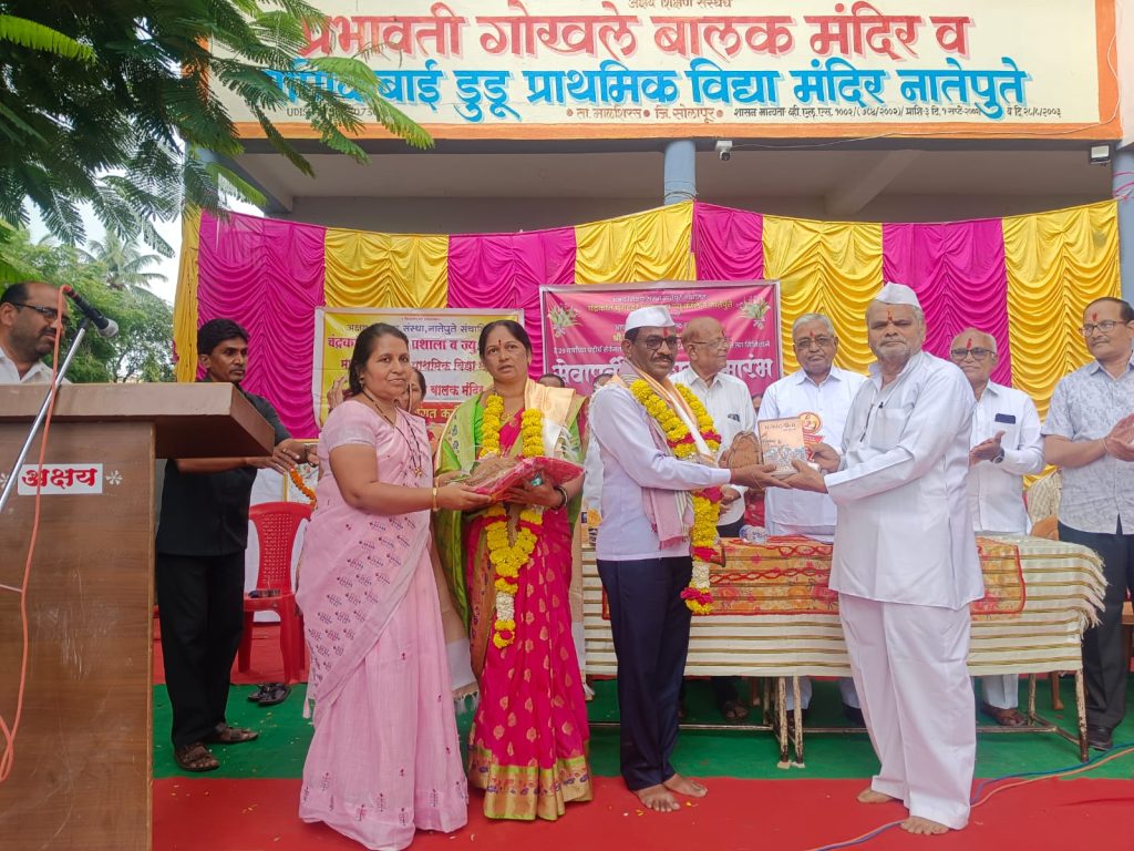 नातेपुते दिनांक येथील अक्षय शिक्षण संस्था नातेपुते संचालित चंद्रकांत घुगरदरे प्रशाला नातेपुते येथे प्रशालेचे क्रीडा विभाग प्रमुख सहशिक्षक सुनिल गोरे सर यांचा सेवा निवृत्ती निमित्ताने सत्कार समारंभ संस्था पदाधिकारी यांच्या शुभहस्ते संपन्न झाला . गोरे सर 29 वर्षाच्या प्रदीर्घ सेवेनंतर सेवा निवृत्त झाले. अक्षय शिक्षण संस्थेचे अध्यक्ष रघुनाथ आण्णा कवितके सचिव दिलीप घुगरदरे प्रशाला समिती सभापती हनुमंत धालपे संचालक महेश ठोंबरे अतुल बावकर अभिजीत घुगरदरे अँड. भारत उराडे हे मान्यवर उपस्थित होते. मनोगतात गोरे सर यांचा गुणगौरव करताना शांत संयमी स्वभावाचे गोरे सर यांनी समर्पित भावनेने काम केले. आपली शाळा सर्वार्थाने मोठी व्हावी यासाठी ते प्रयत्नशील राहिले. क्रीडा क्षेत्रात शाळेचा नावलौकिक उंचावला. विद्यार्थी केंद्र बिंदू मानून त्यांच्या हितासाठी प्रयत्नशील राहिले. सर्व समाज घटकाशी ऋणानुबंध जपले. आपला आम्हाला सार्थ अभिमान राहील. आपली सदैव आठवण येईल असे सांगितले. या प्रसंगी समारंभाचे प्रास्ताविक प्रशालेच्या मुख्याध्यापिका स्मिता आवळे यांनी केले. विद्यार्थी मनोगत दिया वणवे श्रुती काळे यांनी व्यक्त केले. शिक्षक मनोगत पांडुरंग कुचेकर अलका दीक्षित हेमा ढवळे किरण सोरटे यांनी मांडले. सूत्रसंचालन सुखदेव वलेकर यांनी तर आभार प्रदर्शन प्रदीप राऊत यांनी केले.समारंभाच्या यशस्वितेसाठी सर्व विभाग शिक्षक कर्मचारी विद्यार्थी यांनी परिश्रम घेतले