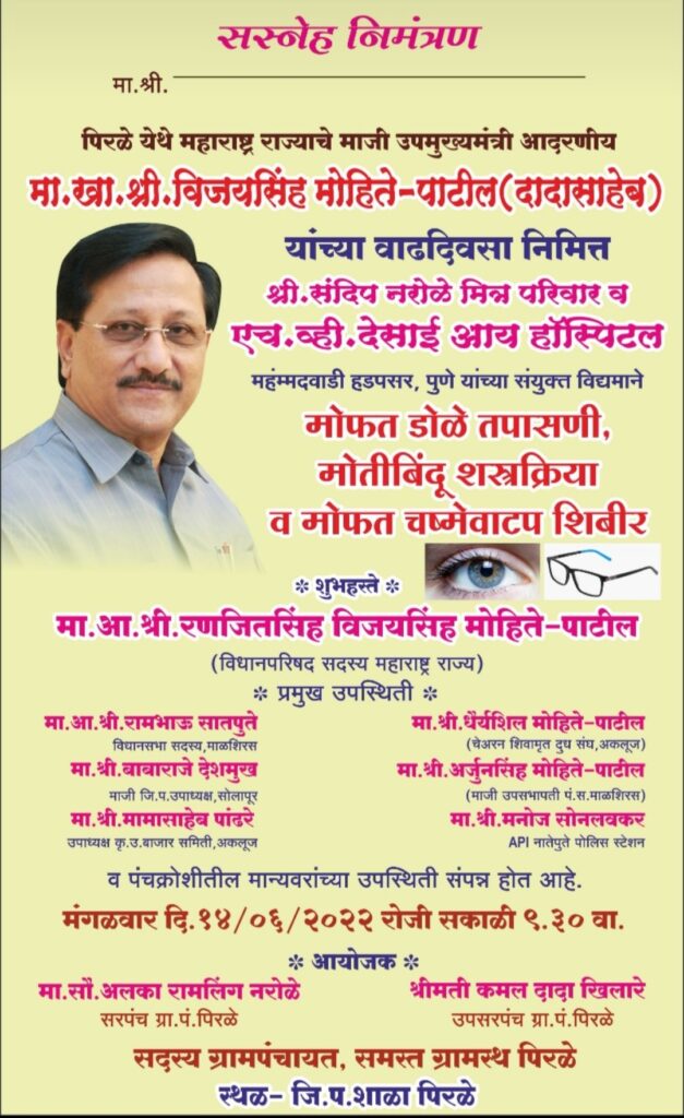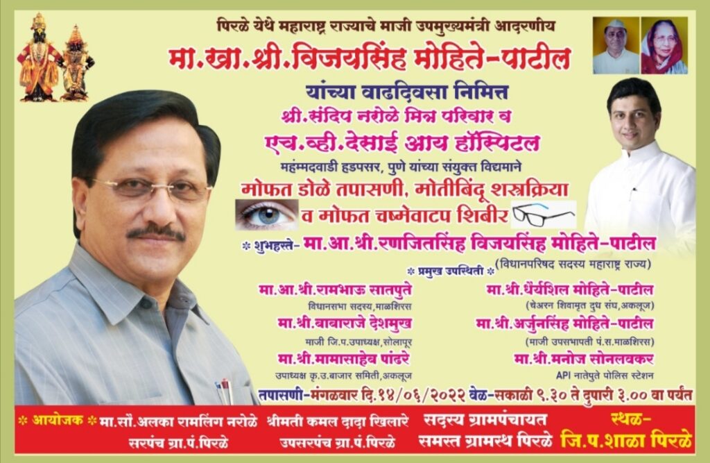महाराष्ट्र राज्याचे माजी उपमुख्यमंत्री. विजयसिंह मोहिते-पाटील यांच्या वाढदिवसानिमित्त संदिप नरोळे मित्रपरिवार व एच. व्ही. देसाई आय हॉस्पिटल महंम्मदवाडी हडपसर पुणे यांच्या संयुक्त विद्यमाने मोफत डोळे तपासणी, मोतीबिंदू शस्त्रक्रिया व मोफत चष्मे वाटप शिबिर दिनांक 14/ 6 /2022 रोजी मा.आ.श्री. रणजितसिंह मोहिते-पाटील यांच्या शुभहस्ते उद्घाटन करून पिरळे व परिसरामधील पेशंटचे डोळे तपासणी डॉक्टर शरद शिंदे डॉक्टर संभाजी जगताप यांनी 440 रुग्णांची करण्यात केली .