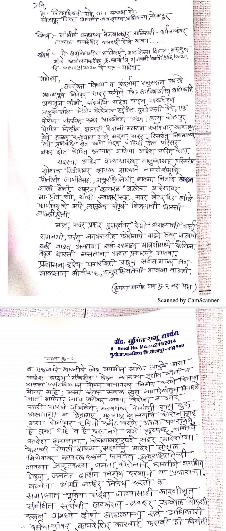 नातेपुते (प्रमोद शिंदे): उपविभागीय अधिकारी शमा पवार यांनी मॉकड्रीलच्या नावाखाली मौजे कोळेगांव हद्दीतील दुपडेवस्ती येथे कोरोना संक्रमित रूग्ण आढळल्याचे पत्र काढून नागरिकांमध्ये भीतीचे वातावरण निर्माण केल्याने त्यांचेसह संबंधित अधिकाऱ्यांवर कायदेशीर कारवाई करावी अशी मागणी सामाजिक कार्यकर्ते एड. सुमित राजू सावंत यांनी सोलापूर जिल्हाधिकाऱ्यांकडे केली आहे.