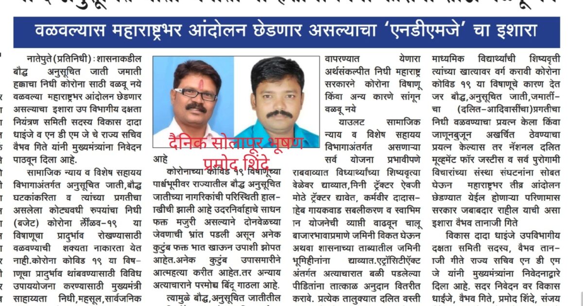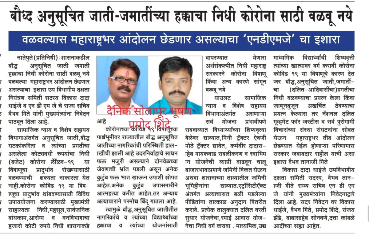सामाजिक न्याय विभागाअंतर्गत असलेला निधी यापूर्वीच्या सरकारच्या काळांमध्ये सुद्धा वळवला आहे तसेच अखर्चित ठेवला आहे त्यामुळे वारंवार संस्था-संघटनांच्या वतीने अनुसूचित जाती व जमातींचा प्रगतीचा निधी वळवू नये किंवा खर्च ठेवू नये म्हणून बजेटचा कायदा करावा अशी मागणीही झालेली आहे यासाठी विधान भवनात विधान परिषदेमध्ये तारांकित प्रश्न सुद्धा उपस्थित झाले आहेत प्रश्न उपस्थित करणारे सध्या महाविकास आघाडीच्या सरकारमध्ये बसलेले आहेत बौद्ध अनुसूचित जाती जमातींच्या प्रगतीसाठी सामाजिक न्याय व विशेष सहाय्य विभागांतर्गत असलेला निधी वळवू नये तसेच अखर्चित ठेवू नये म्हणून शासनाने दोन दिवसांचे पावसाळी अधिवेशन बोलावून त्यामध्ये बजेटचा कायदा पारित करावा अन्यथा शासनाला बौद्ध दलित आदिवासींच्या रोषाला व आंदोलनाला सामोरे जावे लागेल असे निवेदन नॅशनल दलित मोमेंट फॉर जस्टिस या संघटनेच्यावतीने राज्याचे मुख्यमंत्री उद्धवजी ठाकरे व सामाजिक न्याय मंत्री धनंजय मुंडे यांना पाठवण्यात आले आहे निवेदनावर राज्य महासचिव ऍड.डॉ.केवल उके,राज्य विधी सल्लागार ऍड.अनिल कांबळे, राज्य सचिव वैभव गिते,राज्य समन्वयक रमाताई अहिरे,राज्य सहसचिव पी.एस खंदारे,राज्य कोषाध्यक्ष शिवराम कांबळे,राज्य व्यवस्थापक अम्पल खरात,राज्य सहकोषाध्यक्ष शरद शेळके,राज्य संघटक पंचशीला कुंभारकर,राज्य प्रसिद्धीप्रमुख प्रमोद शिंदे यांच्या सह्या आहेत.