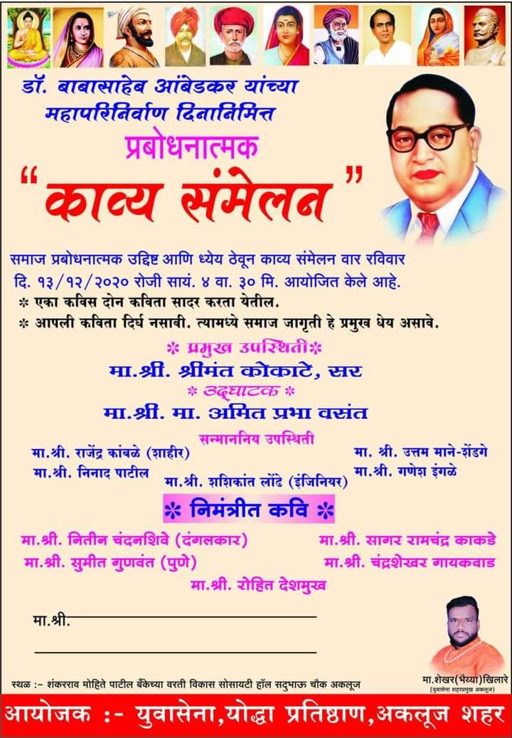 सदरचे संमेलन दिनांक१३.१२.२०२० रोजी सायंकाळी ४.३०वाजता, सदुभाऊ चौक अकलूज येथील विकास सोसायटी हॉल मध्ये होणार असून श्रीमंत कोकाटे (इतिहास संशोधक) व अमित प्रभा वसंत (पेरलोनी) यांच्या प्रमुख उपस्थिती मध्ये समाज प्रबोधनात्मक उद्दिष्ट आणि ध्येय ठेवून प्रबोधनात्मक काव्यसंमेलन आयोजित केले आहे.तरी माळशिरस तालुक्यातील सर्व साहित्यिक,कवी,कार्यकर्ते यांनी उपस्थित रहावे असे आवाहन शेखर खिलारे यांनी केले आहे.तर आपली कविता सादर करायची असेल तर शेखर राजाभाऊ खिलारे 8390009006 या नंबर वरती संपर्क साधावा असेही आवाहन करण्यात आले आहे.