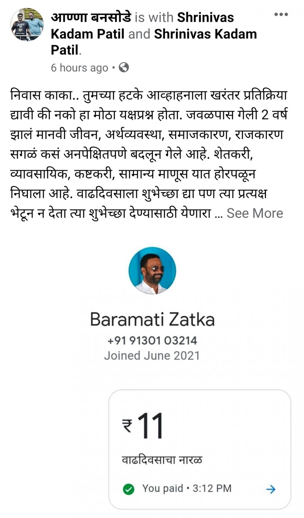 पुरोगामी महाराष्ट्र न्यूज नेटवर्क प्रमोद शिंदे- माळशिरस तालुक्यातील सुप्रसिद्ध बारामती झटका न्यूज पोर्टल यूट्यूब चैनल चे संपादक श्रीनिवास कदम पाटील यांच्या वाढदिवसानिमित्त श्रीनिवास कदम पाटील यांना अभिनेता अण्णा बनसोडे यांच्याकडून अनोख्या पद्धतीने अकरा रुपयाचे अनोख्या अर्थपूर्ण शुभेच्छा देण्यात आल्या शुभेच्छांमुळे सोशल मीडिया चर्चेला उधाण आले आहे.सविस्तर हकीकत अशी की बारामती झटका चे संपादक श्रीनिवास कदम पाटील यांनी वाढदिवसाच्या आदल्या दिवशी प्रेक्षक,चाहते,सोशल मीडियातील मित्रपरिवार यांना आवाहन केले होते.की सध्या कोरणा महामारी सुरू असल्याने मित्र परिवाराला भेटता येत नाही.कोरोना महामारी मुळे सर्वच लोकांचे अर्थकारण बिघडले आहे.त्यामुळे अनाठायी खर्च लोकांनी टाळावा वाढदिवसाला शुभेच्छा देण्यासाठी पेट्रोल खर्च,हारतुरे,फेटा यासाठी खर्च होतो व तो खर्च वाया जातो हा खर्च टाळून माझ्यावर प्रेम करणारे प्रेक्षक,वाचक व सोशल मीडियातील मित्रपरिवाराने वाढदिवसानिमित्त जाहिराती स्वरूपात अर्थपूर्ण शुभेच्छा द्याव्यात.अशी बातमी व पोस्ट केली होती या पोस्टचे गांभीर्य लक्षात घेऊन अभिनेता अण्णा बनसोडे यांनी फुल ना फुलाची पाकळी म्हणून श्रीनिवास कदम पाटील यांना सन्मानजनक नारळाची किंमत म्हणून ऑनलाइन अकरा रुपये देऊन श्रीनिवास कदम पाटील यांना सोशल मीडियाद्वारे वाढदिवसाच्या आदर पूर्ण शुभेच्छा दिल्या.त्या अकरा रुपया मध्ये अनेक भावना व्यक्त केल्या गेल्या आहेत. त्या भावनांचा मनस्वी स्वीकार श्रीनिवास कदम पाटील यांनी केला.श्रीनिवास कदम पाटील यांनी अतिशय विचारपूर्वक आपल्या मनातील भावना व्यक्त केल्या होत्या.पत्रकार हा वर्षभर आपल्या पत्रकारितेच्या माध्यमातून अनेक गोष्टी जनतेच्या समोर आनत असतो.अनेक राजकीय संघटना ,विविध पक्षातील पदाधिकारी यांच्या बातम्या अहोरात्र पत्रकार प्रसिद्ध करत असतात.प्रत्येक कार्यक्रमाला हजर राहून त्या बातमीचे कवरेज करून ती बातमी लाखो लोकांपर्यंत पोचवत असतात.त्या बातमीच्या माध्यमातून लोकप्रतिनिधी, पक्ष संघटनातील पदाधिकारी यांचं काम लाखो लोकांपर्यंत पोहोचते. त्यांना उजाळा मिळतो परंतु विचार केला तर बातमीनंतर पत्रकाराला काय मिळते? बातमी तयार करण्यासाठी पत्रकाराला गाडीमध्ये शंभर दोनशे रुपयाचे पेट्रोल टाकावे लागते,.फोर व्हीलर घेऊन गेला तर तीनशे ते पाचशे रुपये खर्च येतो.कार्यक्रमाला एक दोन तास वेळ द्यावा लागतो.बातमी तयार करायला दोन तास वेळ द्यावा लागतो.एका बातमीसाठी पत्रकाराचे ते चार ते पाच तास जातात.त्याला स्वतः इंटरनेट बॅलन्स करावा लागतो.त्याला ऑफिस असेल तर महिन्याला तीन ते चार हजार रुपये ऑफिस चे भाडे भरावे ला