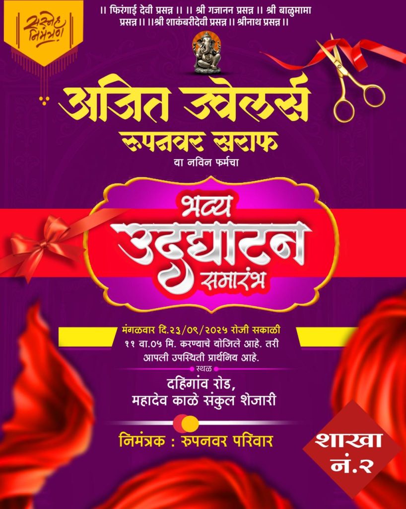 अजित ज्वेलर्स रुपनवर सराफ, नातेपुते.शोरूमच्या उद्घाटन प्रसंगी आपली उपस्थिती प्रार्थनीय🙏💐 दहिगाव रोड, महादेव काळे संकुल शेजारी