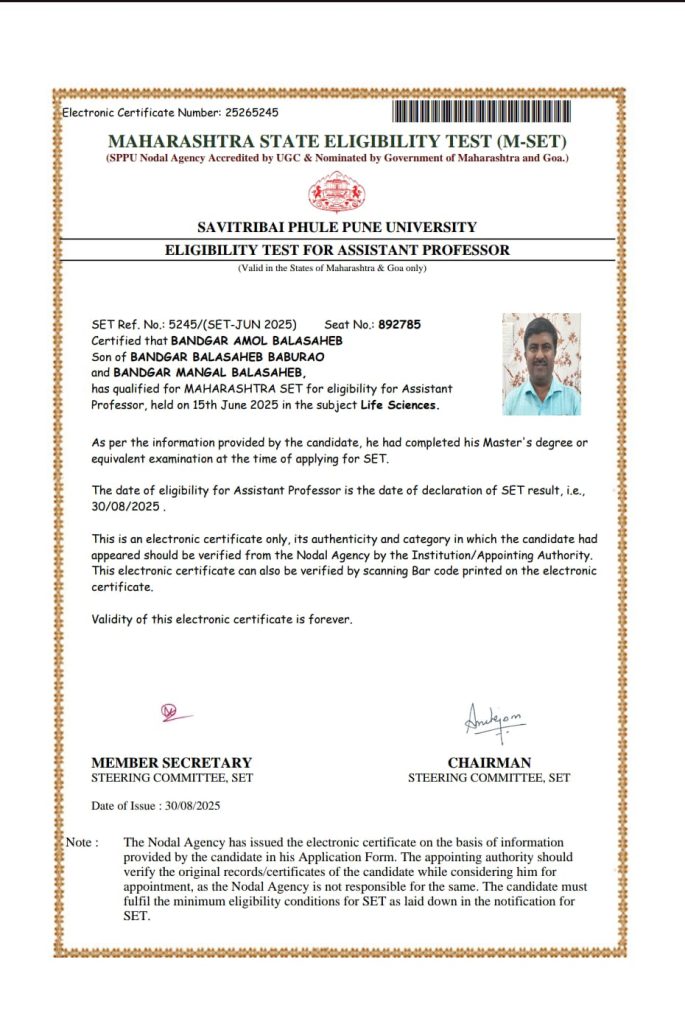 बंडगर सरांनी जीवन विज्ञान या विषयामधून 15 जून 2025 रोजी पुणे विद्यापीठाच्या वतीने घेण्यात आलेल्या महाराष्ट्र SET परीक्षेला बसले होते. 30 ऑगस्ट 2025 रोजी निकाल जाहीर झाला असता ते यशस्वी ठरले. यामुळे ते आता सहाय्यक प्राध्यापक पदासाठी पात्र ठरले आहेत. SET परीक्षा ही UGC मान्यताप्राप्त आणि महाराष्ट्र तसेच गोवा राज्यांतील उच्चशिक्षण संस्थांमध्ये प्राध्यापक म्हणून नियुक्तीसाठी आवश्यक असलेली अत्यंत प्रतिष्ठेची पात्रता मानली जाते.