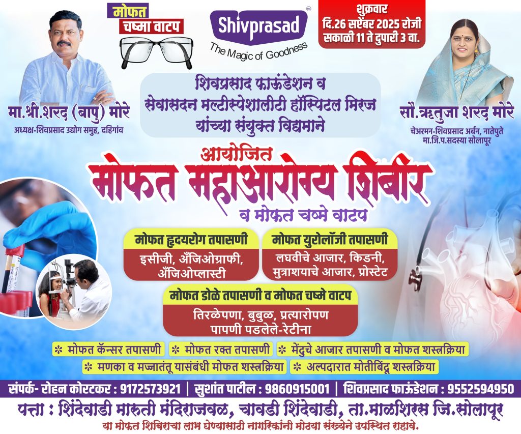 शिवप्रसाद फाउंडेशन व सेवासदन मल्टीस्पेशालिटी हॉस्पिटल मिरज यांच्या संयुक्त विद्यमाने आयोजित मोफत आरोग्य शिबिर व मोफत चष्मे वाटप