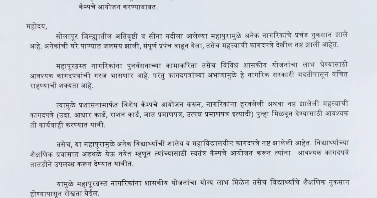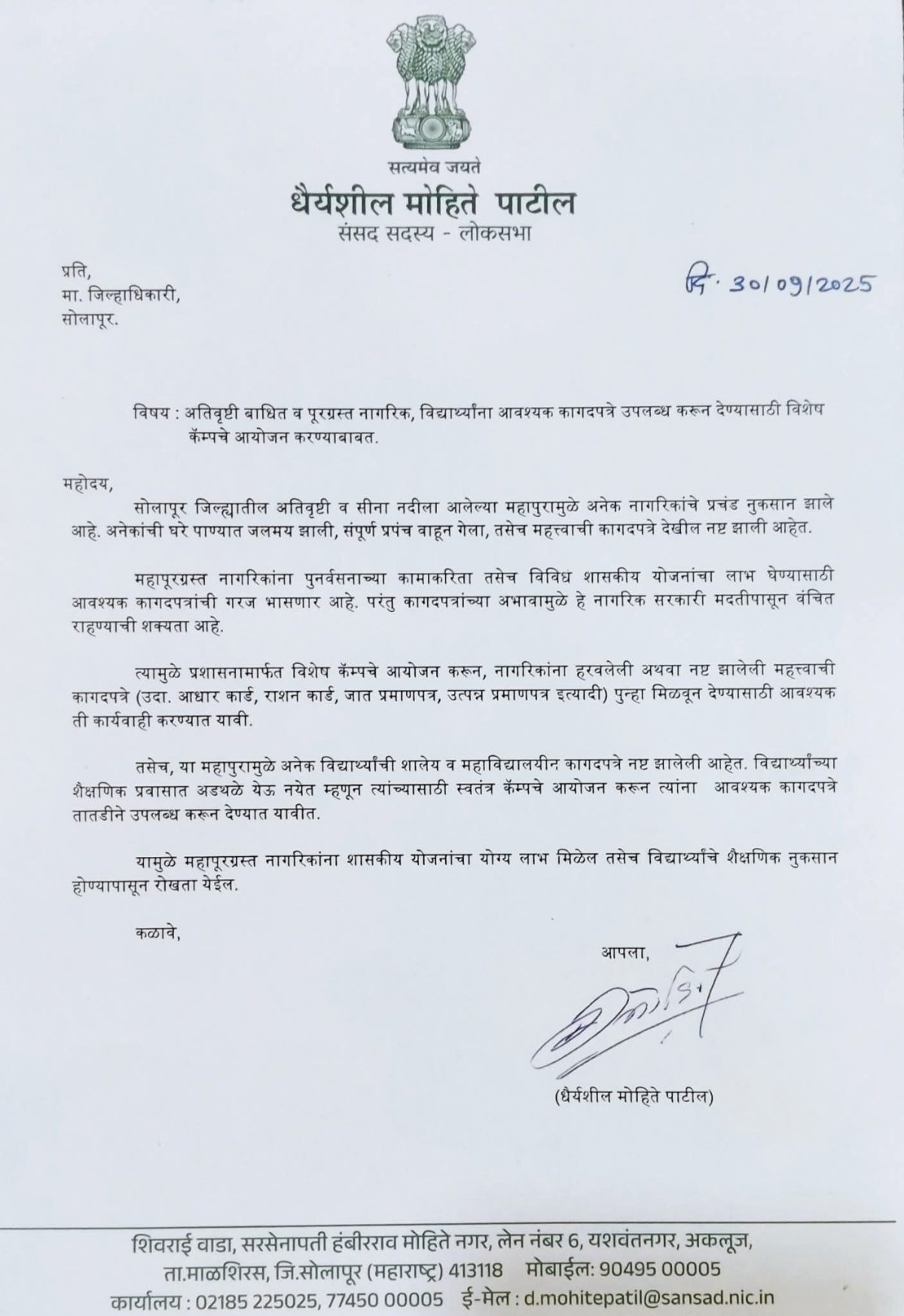 माढा लोकसभेचे विद्यमान खासदार धैर्यशील मोहिते पाटील यांनी अतिवृष्टी बाधित व पुरग्रस्त नागरिक विद्यार्थ्यांना आवश्यक कागदपत्रे उपलब्ध करून देण्यासाठी विशेष कॅम्प आयोजित करण्याची मागणी सोलापूर जिल्हा अधिकारी कुमार आशीर्वाद यांच्याकडे पत्राद्वारे केली.सोलापूर जिल्ह्यातील अतिवृष्टी व सीना नदीला आलेल्या महापुरामुळे अनेक नागरिकांचे प्रचंड नुकसान झाले आहे. अनेकांची घरे पाण्यात जलमय झाली, संपूर्ण प्रपंच वाहून गेला, तसेच महत्त्वाची कागदपत्रे देखील नष्ट झाली आहेत. महापूरग्रस्त नागरिकांना पुनर्वसनाच्या कामाकरिता तसेच विविध शासकीय योजनांचा लाभ घेण्यासाठी आवश्यक कागदपत्रांची गरज भासणार आहे. परंतु कागदपत्रांच्या अभावामुळे हे नागरिक सरकारी मदतीपासून वंचित राहण्याची शक्यता आहे. त्यामुळे प्रशासनामार्फत विशेष कॅम्पचे आयोजन करून, नागरिकांना हरवलेली अथवा नष्ट झालेली महत्त्वाची कागदपत्रे (उदा. आधार कार्ड, राशन कार्ड, जात प्रमाणपत्र, उत्पन्न प्रमाणपत्र इत्यादी) पुन्हा मिळवून देण्यासाठी आवश्यक ती कार्यवाही करण्यात यावी म्हणून सांगितले आहे.तसेच, या महापुरामुळे अनेक विद्यार्थ्यांची शालेय व महाविद्यालयीन कागदपत्रे नष्ट झालेली आहेत. विद्यार्थ्यांच्या शैक्षणिक प्रवासात अडथळे येऊ नयेत म्हणून त्यांच्यासाठी स्वतंत्र कॅम्पचे आयोजन करून त्यांना आवश्यक कागदपत्रे तातडीने उपलब्ध करून देण्यात यावीत.यामुळे महापूरग्रस्त नागरिकांना शासकीय योजनांचा योग्य लाभ मिळेल तसेच विद्यार्थ्यांचे शैक्षणिक नुकसान होण्यापासून रोखता येईल. अशा प्रकारच्या आशयाचे पत्र जिल्हाधिकारी यांना देण्यात आले आहे.